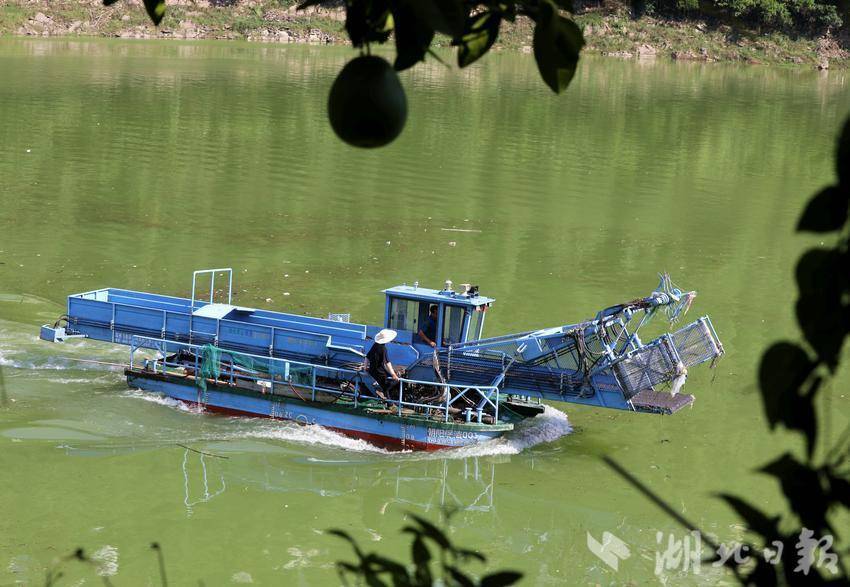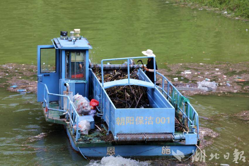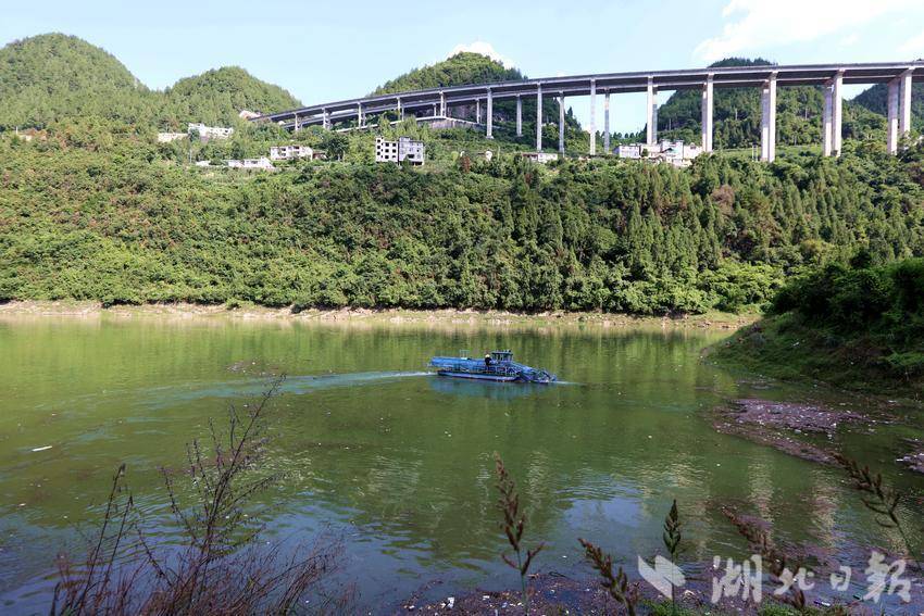 烈日正炎,在咸豐縣朝陽寺鎮(zhèn)朝陽庫區(qū),工作人員熟練操控清漂船,忙碌地打撈河面上滯留的漂浮物。